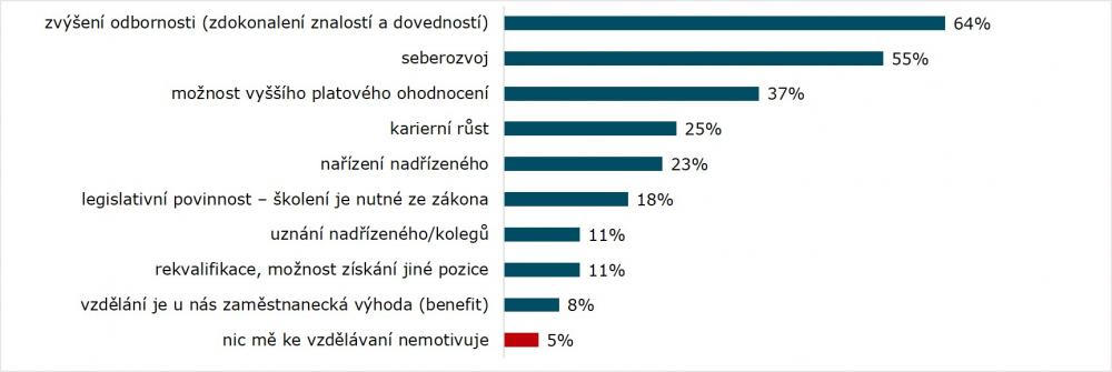 Nejvíce lidi motivuje ke vzdělávání zvýšit si odbornost (64%), následuje potřeba seberozvoje (tu uvedlo 55% dotázaných). Seberozvojem lze chápat vše, co pomůže k lepšímu vzájemnému vztahu na pracovišti i v osobním životě, ať se jedná o komunikační dovednosti, řešení konfliktů nebo řešení stresových situací, popř. hospodaření s časem.