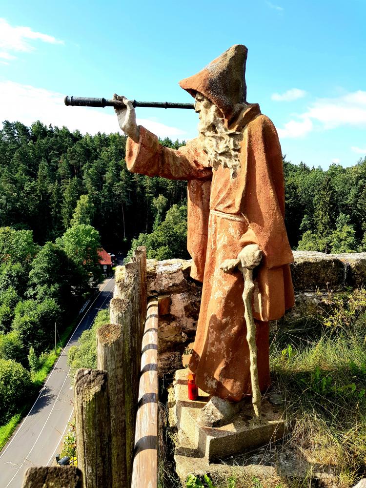 Pak jsme sestoupali dolů a vrhli se i do slibovaných pohádkových míst. Navštívili jsme pískovcový hrádek ve vesnici Sloup v Čechách, na kterém žijí opravdoví poustevníci. Jeden z nich je tam dodnes a pozorně sleduje asi dva kilometry vzdálený lesní Modlivý důl.